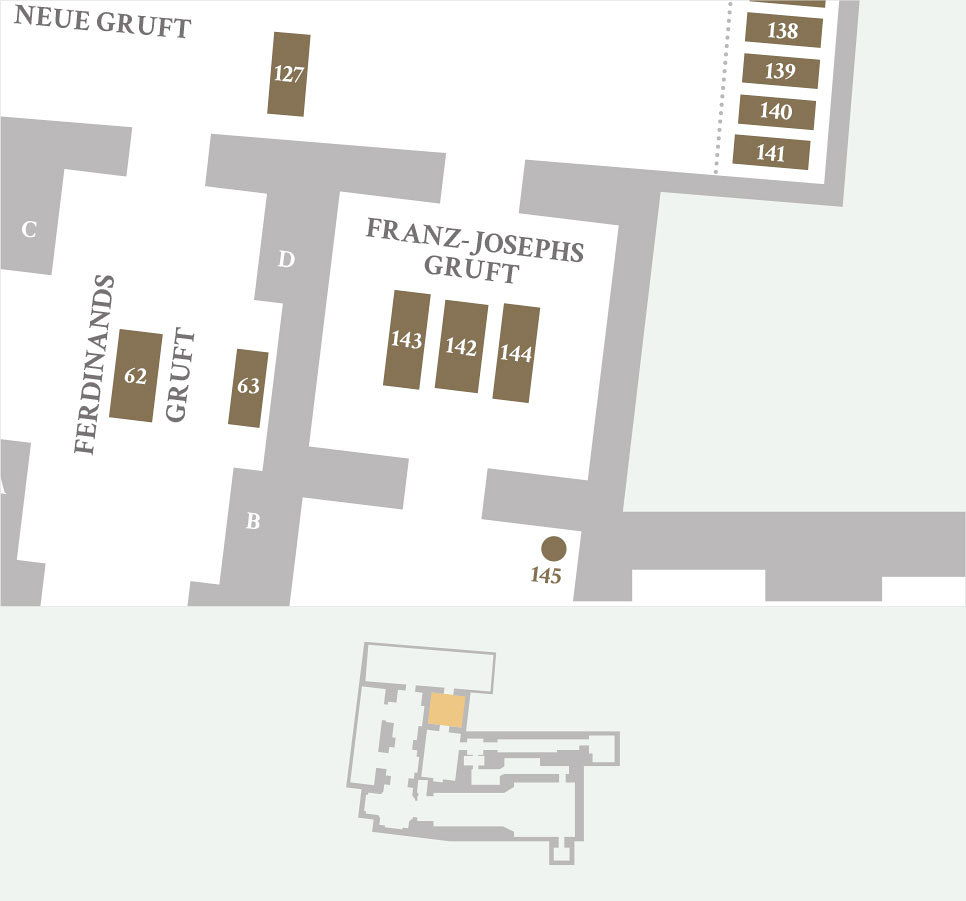 On the occasion of his 60th anniversary of his reign in 1908, Emperor Franz Joseph I. (N°142) had additional cellar rooms of the monastery incorporated into the crypt and commissioned the design of a chapel and a dignified mausoleum for himself, his wife Empress Elisabeth (N°143) and the heir to the throne, Crown Prince Rudolf (N°144).
